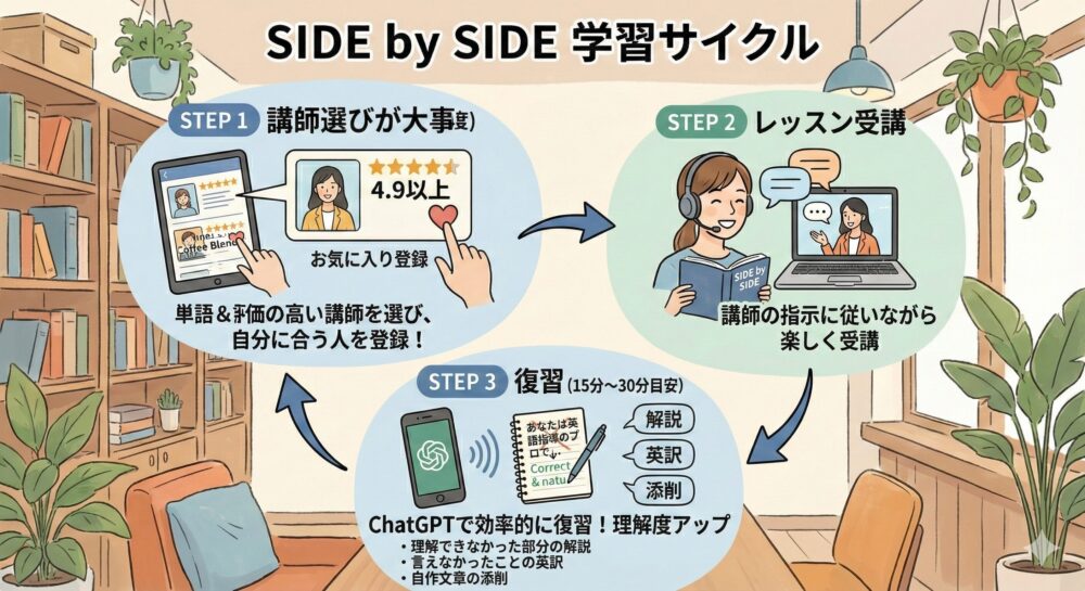 講師検索時の対応教材をSIDE by SIDEにし、評価の高い講師を選びましょう。4.9以上が目安です。