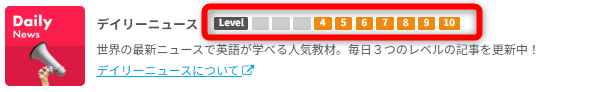 教材に記載されているレベルは、上記の表に対応しています。例えば、下記のデイリーニュースの場合は、レベル4~レベル10まで対応しています。